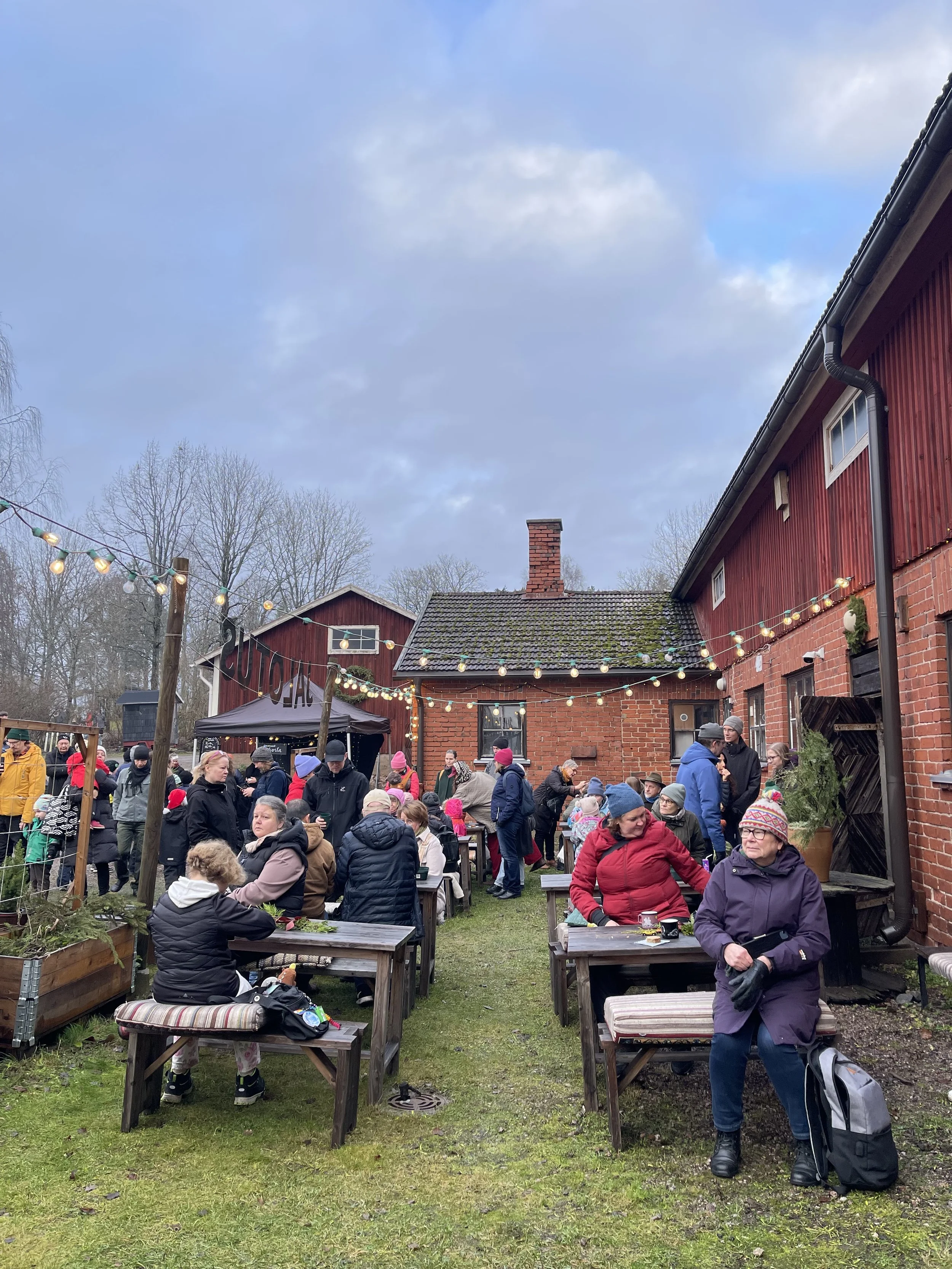 Joulun maku löytyi glögistä, vegaanisesta joulupuurosta ja nuotiolla grillatusta suippokaalista. Kahvilan asiakkaat saattoivat tuoda omat kupit mukanaan ja saada santsin kiitokseksi. Pienet teot muistuttivat, ettei juhlaan tarvitse aina kertakäyttöistä.